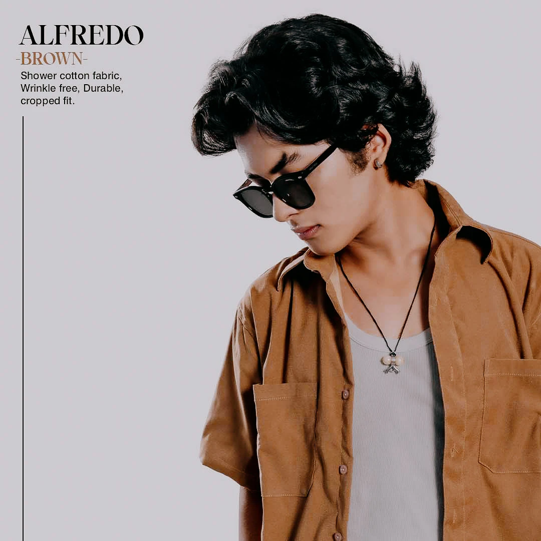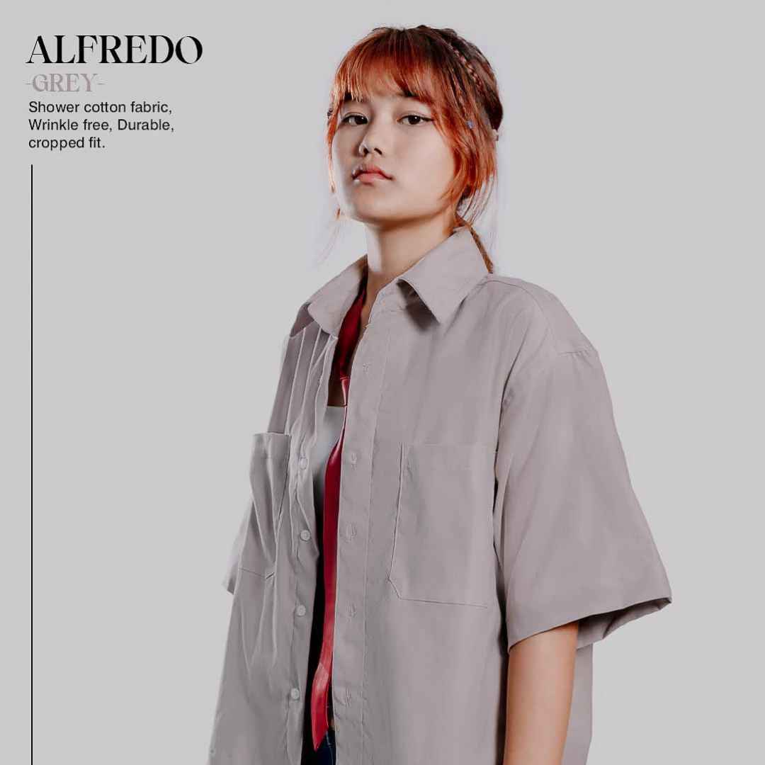 "Upgrade your style with ALFREDO (Shower Cotton Cropped Fit Shirt). Available in black, beige, and grey.